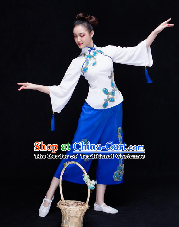 Traditional Chinese Classical Dance Yangge Fan Dancing Costume, Folk Dance Drum Dance White Uniform Yangko Costume for Women