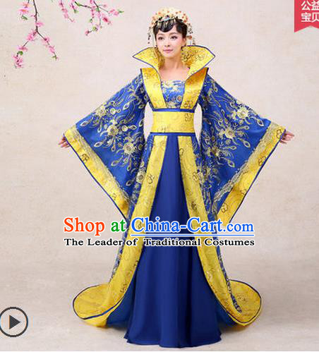 13884. Traditional Chinese Ancient Queen Blue Costume Tang Dynasty Empress Historical Clothing and Headpiece Complete Set