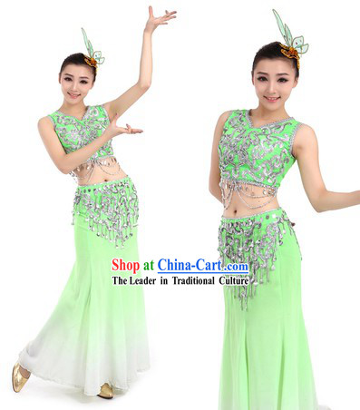 49564. Traditional Chinese Dai Nationality Peacock Dance Costume, Folk Dance Ethnic Pavane Clothing, Chinese Minority Nationality Dance Green Dress for Women